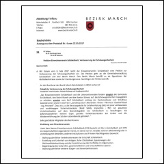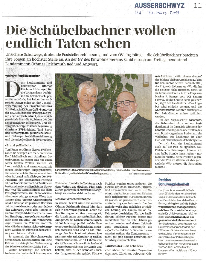 Am Freitag, 5. Mai 2017, durften wir die Petition beim Gemeindehaus an den Gemeindepräsidenten Stefan Abt und Bruno Stolz, Gemeindeschreiber, übergeben. Auch ein Pressevertreter des March-Anzeigers war vor Ort. Kopien der detaillierten Forderung wurden an den Regierungsrat des Kantons Schwyz sowie an den Bezirksrat der March per Einschreiben übermittelt. Das entsprechende Schreiben sowie der Presseartikel und weitere Details sind unten einsehbar.